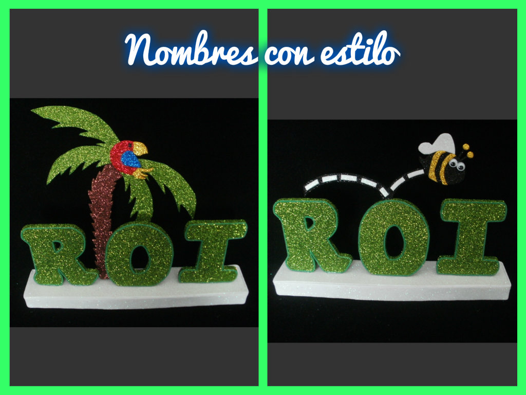 Nombres sobre base de 2cm de alto.Las letras se realizan en gomaeva brillante (muchos colores a elegir).Tamaño de las letras : 9cm de alto.Personalizaciones infinitas!!Versión infantil y no tan infantil (podemos poner nombres y /o logos de empresas!).